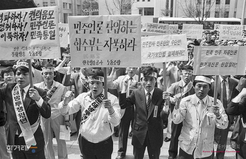 - 1989년 4월 18일 낮 12시 전국언론노동조합연맹 소속 각 신문 방송 통신사의 언론노동자 5백여명이 서울 중구 태평로 프레스센터 앞 광장에서 민주언론쟁취를 위한 전국언론노동자 결의대회를 갖고 한겨레신문 탄압중지 등의 구호를 외치고 있다.