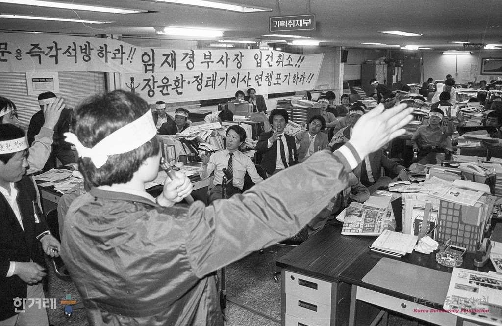 - 1989년 4월 18일 한겨레신문에 대한 당국의 탄압을 규탄하고 민주언론 쟁취를 다짐하며 농성중인 한겨레신문 편집국에 각계 인사들의 격려 방문이 잇따르고 있다.