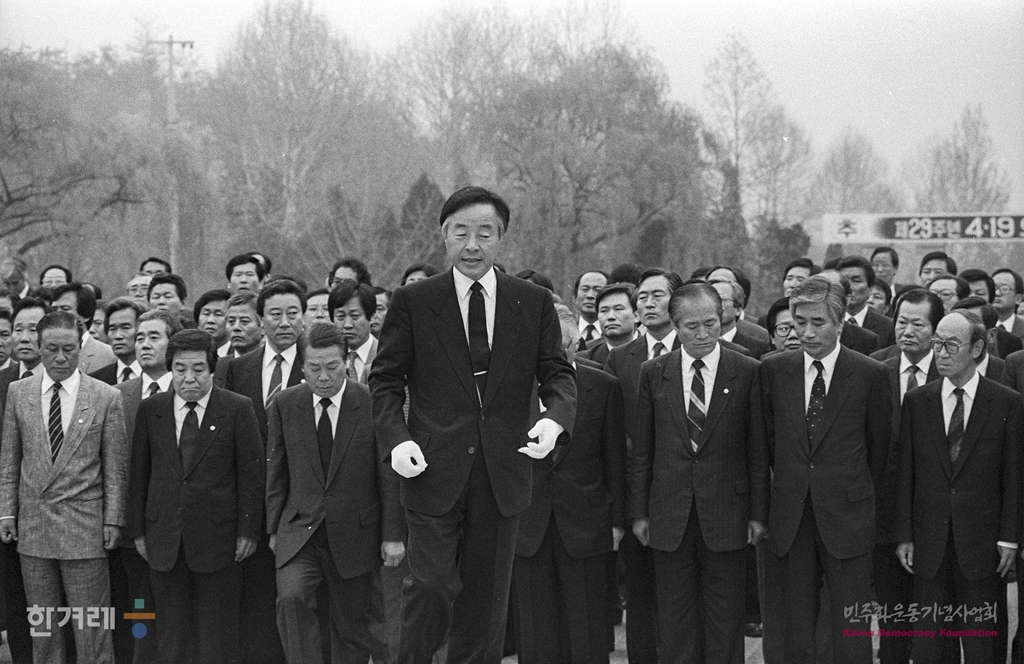 - 1989년 4월 19일 오후 3시 4.19혁명 29주년을 맞아 서울 도봉구 수유동 4.19묘소에서 김영삼 민주당 총재를 비롯한 당 관계자들이 참배를 하고 있다.