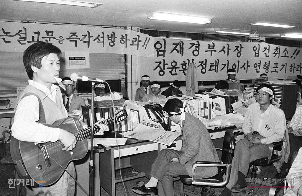 - 1989년 4월 19일 국가안전기획부의 한겨레신문 장윤환 편집위원장과 정태기 이사 겸 개발본부장에 대한 구인영장 청구가 20일중에 할 것으로 알려진 가운데 한겨레신문 편집국에서 사원들이 비상총회가 정태춘씨가 지지공연을 하고 있다.