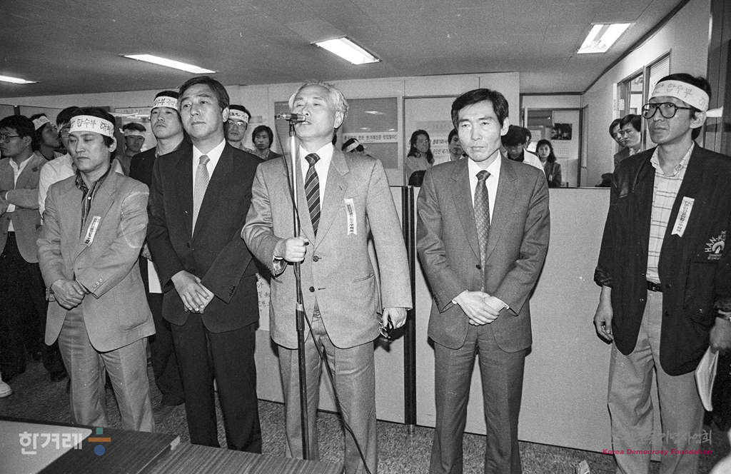 - 1989년 4월 20일 북한취재계획과 관련해서 한겨레신문 장윤환 편집위원장과 정태기 이사겸 개발본부장이 안기부 수사관들에 의해 구인되기 앞서 한겨레신문 편집국에서 사원들에게 인사를 하고 있다.