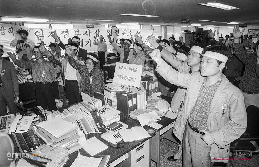 - 1989년 4월 20일 한겨레신문의 북한취재 계획과 관련해서 장윤환 편집위원장과 정태기 이사겸 개발본부장이 안기부 수사관들에 의해 구인되기 전 민주언론 수호의지를 다지는 연설을 하자 기자들이 구호를 외치며 답하고 있다