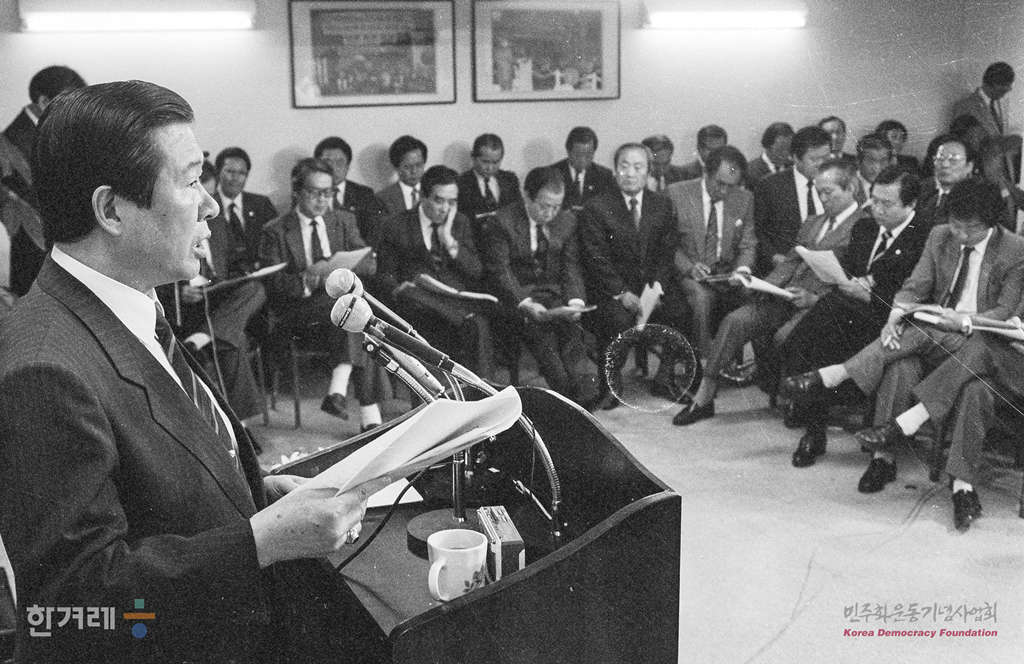 - 1989년 4월 20일 김대중 평민당 총재는 여의도 중앙당사에서 한겨레신문에 대한 언론탄압과 5공청산과 민주화, 노사관계와 학원문제, 7.7선언과 북방외교 등의 정치현안에 대해 입장을 밝히는 기자회견을 하고 있다.