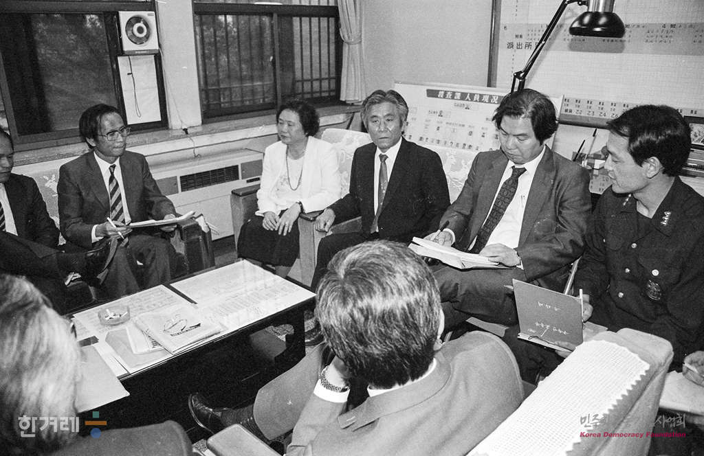 - 1989년 4월 20일 오후6시 이영희 한겨레신문 논설고문이 서울 중부경찰서 수사과장실에서 홍성우 황인철 한승헌 변호사 등 한겨레신문 이고문의 변호인단 11명과 부인 윤영자씨를 만나 안기부 조사과정 등에 대해 말하고 있다.