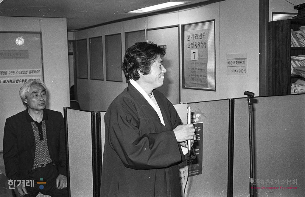 - 1989년 4월 20일 한겨레신문의 북한취재 계획과 관련해서 장윤환 편집위원장과 정태기 이사겸 개발본부장이 안기부 수사관들에 의해 구인되기 전 지지방문을 백기완선생이 편집국을 둘러보고 있다.