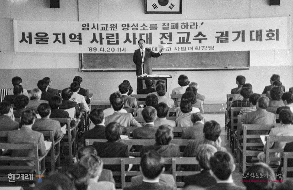 - 1989년 4월 20일 11시 한양대 중앙대 고려대 등 서울지역 14개 사립대학 교수 2백여명은 한양대 사범대 강당에서 서울지역 사립사대 전교수 궐기대회를 갖고 문교부는 임시중등교원양성소 설치 게획을 철혜하라고 촉구하고 있다. 문교부는 지난해 정기국회에서 9천 5백명의 교원을 특별증원키로 한 게획을 발표했다.