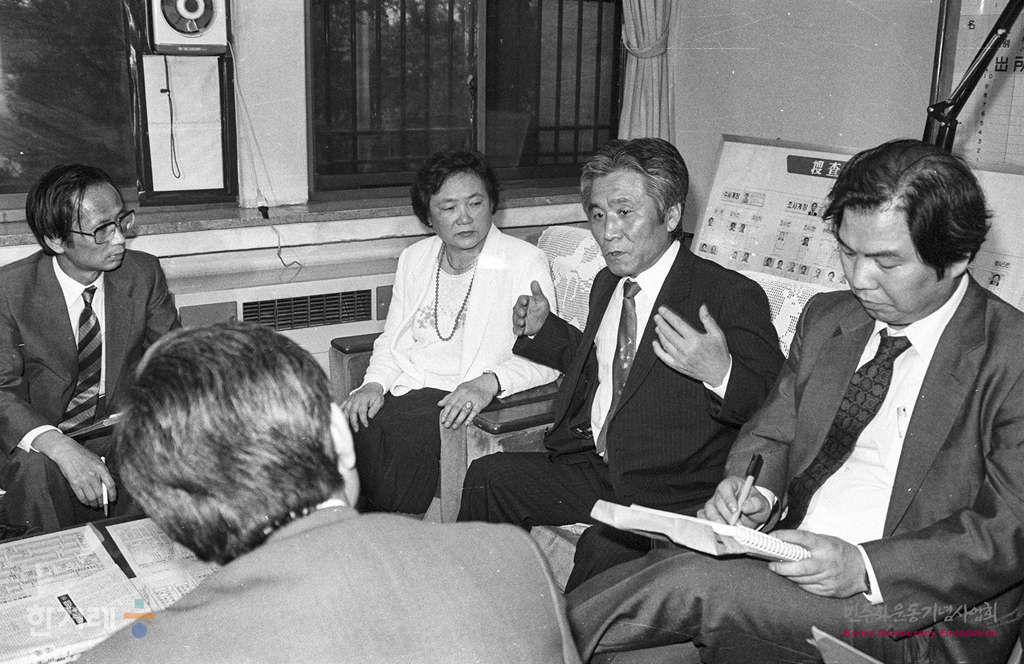 - 1989년 4월 20일 오후6시 이영희 한겨레신문 논설고문이 서울 중부경찰서 수사과장실에서 홍성우 황인철 한승헌 변호사 등 한겨레신문 이고문의 변호인단 11명과 부인 윤영자씨를 만나 안기부 조사과정 등에 대해 말하고 있다.