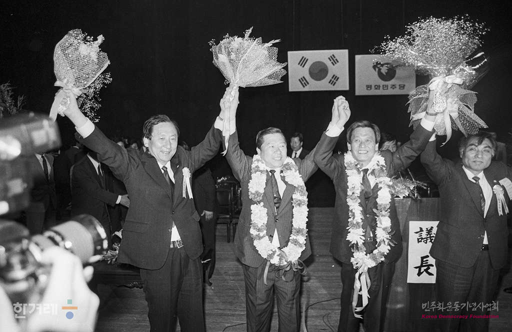 - 1989년 4월 21일 당내 민주화의 첫 시도이자 민선 서울시장 후보선출의 전초전으로 관심을 모은 평민당의 서울시지부 위원장 경선이 서울 세종문화회관 별관에서 열려 김대중 총제가 경선에서 당선된 조윤형 의원과 낙선한 두 후보와 함께 대의원들의 환호에 답하고 있다.