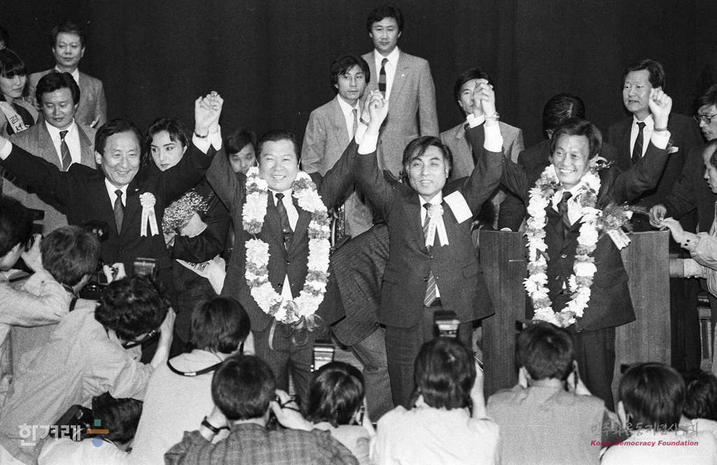 - 1989년 4월 21일 당내 민주화의 첫 시도이자 민선 서울시장 후보선출의 전초전으로 관심을 모은 평민당의 서울시지부 위원장 경선이 서울 세종문화회관 별관에서 열려 김대중 총제가 경선에서 당선된 조윤형 의원과 낙선한 두 후보와 함께 대의원들의 환호에 답하고 있다.