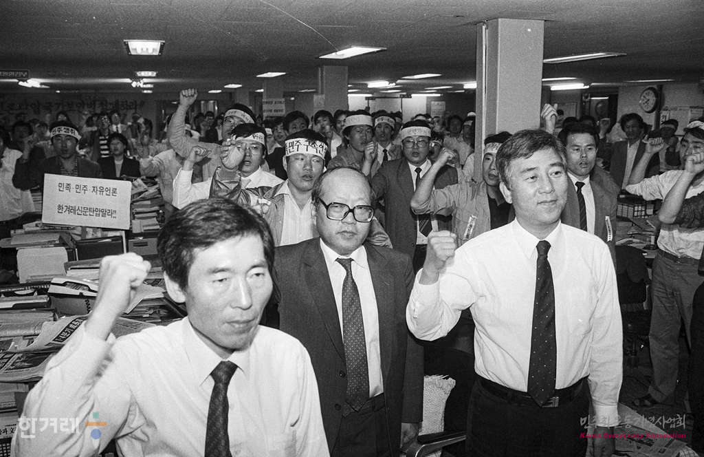 - 1989년 4월 21일 밤 한겨레신문 북한취재 계획과 관련 안기부에 구인돼 조사를 받고 풀려난 장윤환 편집위원장과 정태기 이사가 한겨레신문 편집국에서 열린 사원총회에서 3백여 사원들과 함께 이영희 논설고문의 석방을 촉구하고 있다.