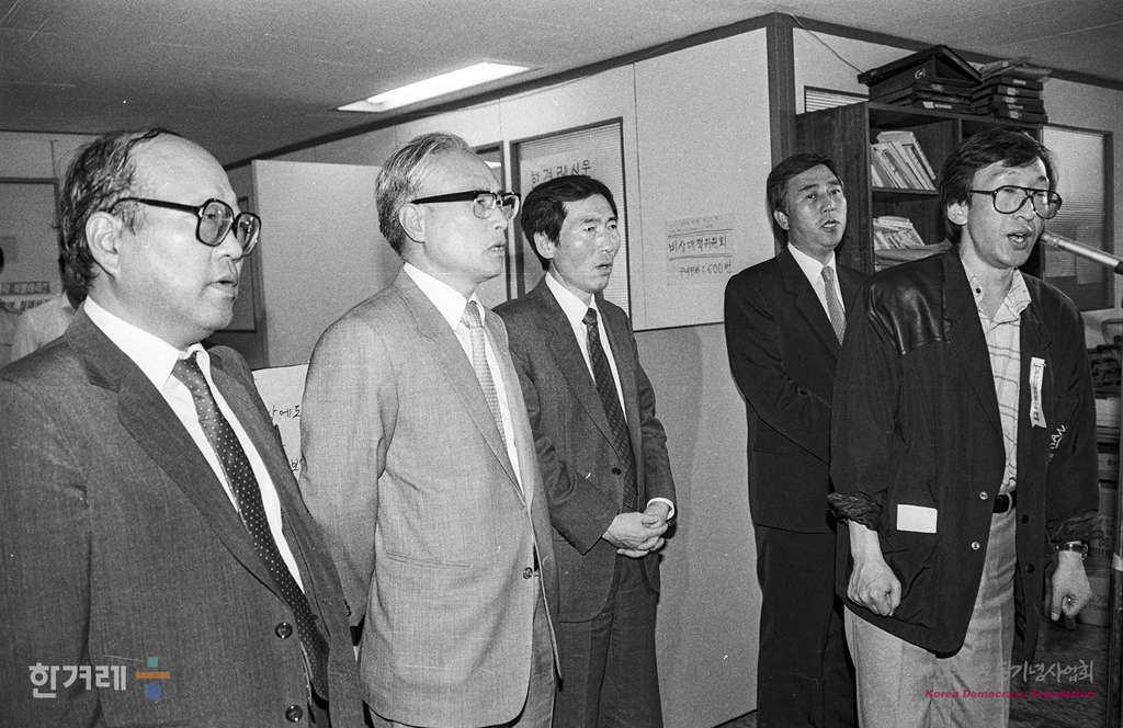 - 1989년 4월 21일 밤 한겨레신문 북한취재 계획과 관련 안기부에 구인돼 조사를 받고 풀려난 장윤환 편집위원장과 정태기 이사가 한겨레신문 편집국에서 열린 사원총회에서 3백여 사원들과 함께 이영희 논설고문의 석방을 촉구하고 있다.