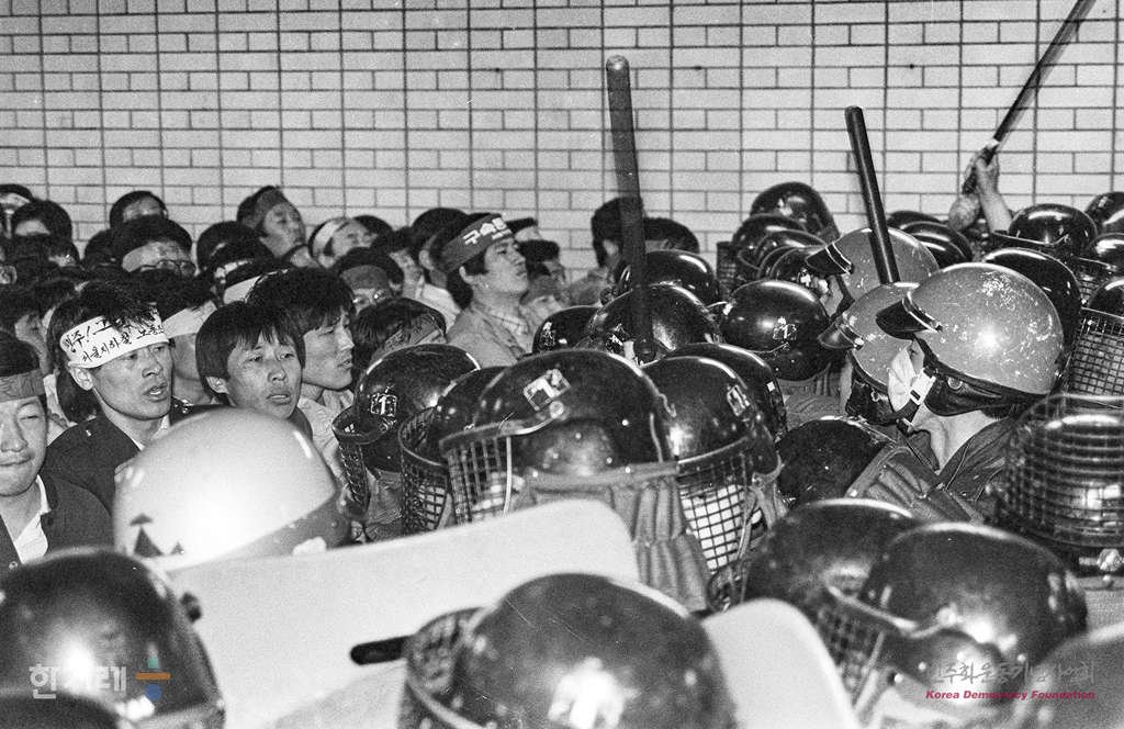- 1989년 4월 21일 서울지하철노조 제2상임집행위원회에 참가한 조합원 1천5백여명이 서울 사당역 구내 지하광장에서 무노동 무임금 철회 및 노조탄압규탄대회를 하자 경찰이 제지하고 있다. 이날 위원회는 서초구 방배동 지하철공사 본사 마당에서 집회를 가질 예정이었으나 공사쪽의 불법집회를 이유로 장소사용을 불허하고 경찰이 워천봉쇄를 했다.