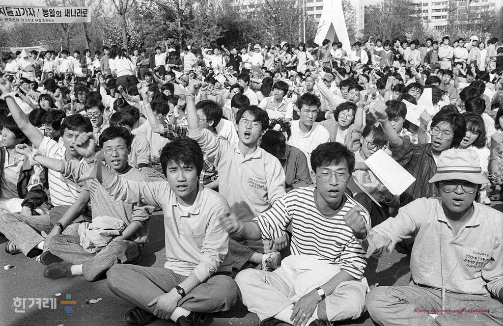 - 1989년 4월 21일 서총련산하 서울지구 동부지역 총학생회연합 발대식에 서울 건국대에서 열려 한양대를 비롯한 동부지역 대학생들이 집회를 하고 있다.