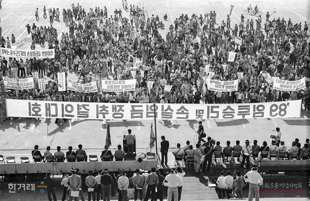 - 1989년 4월 21일 오후3시 전국자동차노조연맹 조합원 4천여명이 서울 송파구 잠실동 탄천주차장에서 완전월급제와 정부의 운수노동자의 손실임금을 반환해 줄 것을 요구하며 89전국임투승리 및 손실임금쟁취 결의대회를 하고 있다