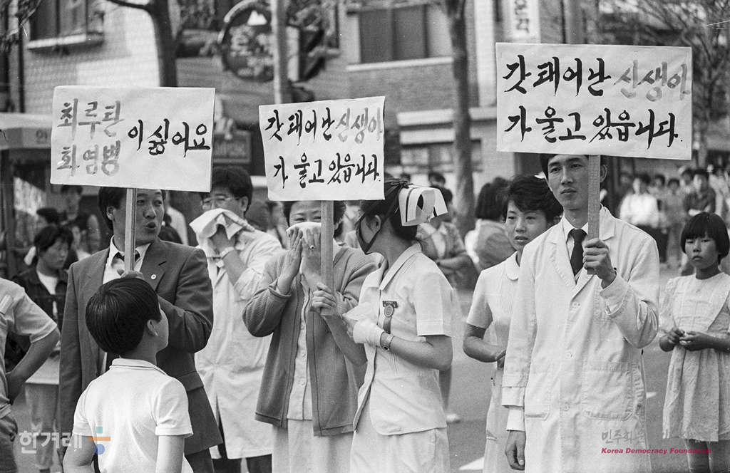 - 1989년 4월 21일 서총련산하 서울지구 동부지역 총학생회연합 발대식에 서울 건국대에서 열려 한양대를 비롯한 동부지역 대학생들이 집회를 하자 인근 병원관계자들이 시위반대 시위를 하고 있다.