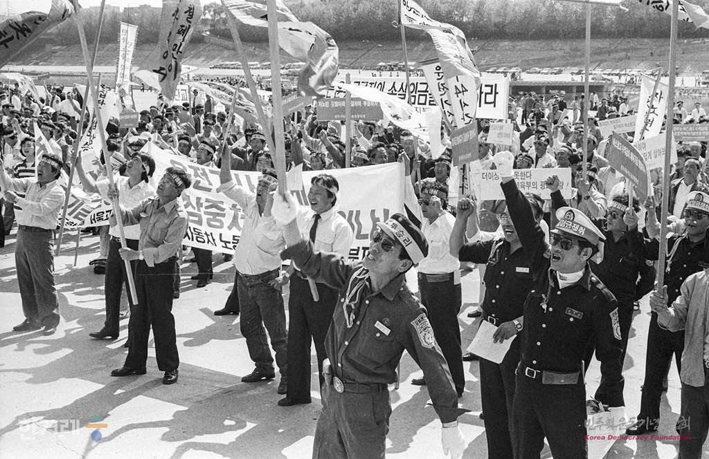 - 1989년 4월 21일 오후3시 전국자동차노조연맹 조합원 4천여명이 서울 송파구 잠실동 탄천주차장에서 완전월급제와 정부의 운수노동자의 손실임금을 반환해 줄 것을 요구하며 89전국임투승리 및 손실임금쟁취 결의대회를 하고 있다