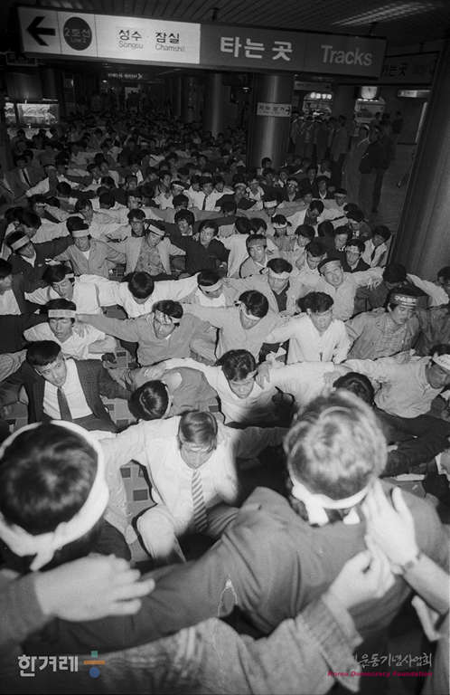 - 1989년 4월 21일 서울지하철노조 제2상임집행위원회에 참가한 조합원 1천5백여명이 서울 사당역 구내 지하광장에서 무노동 무임금 철회 및 노조탄압규탄대회를 하고 있다. 이날 위원회는 서초구 방배동 지하철공사 본사 마당에서 집회를 가질 예정이었으나 공사쪽의 불법집회를 이유로 장소사용을 불허하고 경찰이 워천봉쇄를 했다.