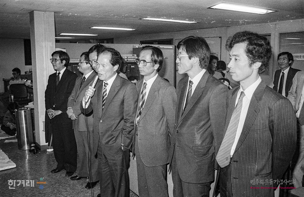 - 1989년 4월 21일 밤 한겨레신문 북한취재 계획과 관련 안기부에 구인돼 조사를 받고 풀려난 장윤환 편집위원장과 정태기 이사가 한겨레신문 편집국에서 열린 사원총회에서 3백여 사원들과 함께 이영희 논설고문의 석방을 촉구하고 있다.