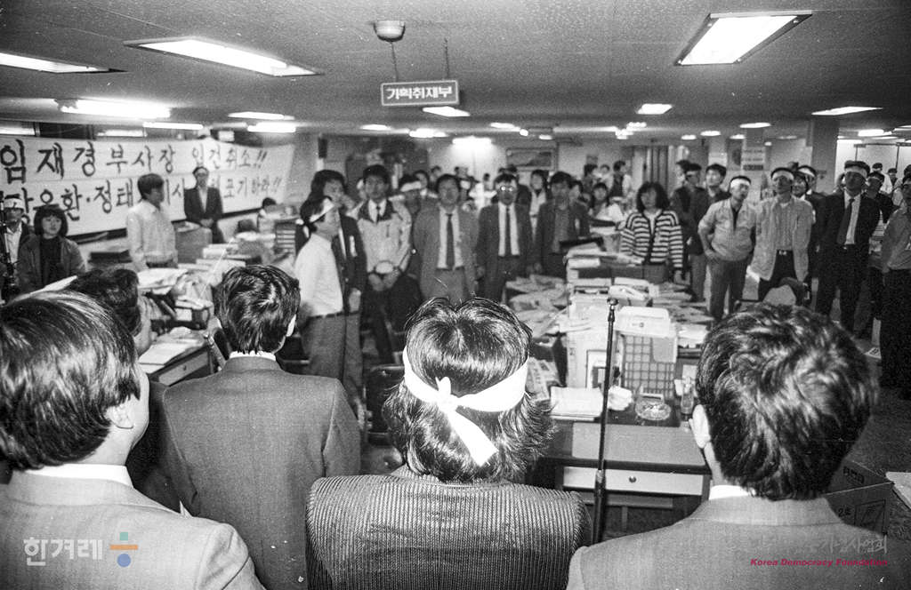 - 1989년 4월 21일 밤 한겨레신문 북한취재 계획과 관련 안기부에 구인돼 조사를 받고 풀려난 장윤환 편집위원장과 정태기 이사가 한겨레신문 편집국에서 열린 사원총회에서 3백여 사원들과 함께 이영희 논설고문의 석방을 촉구하고 있다.