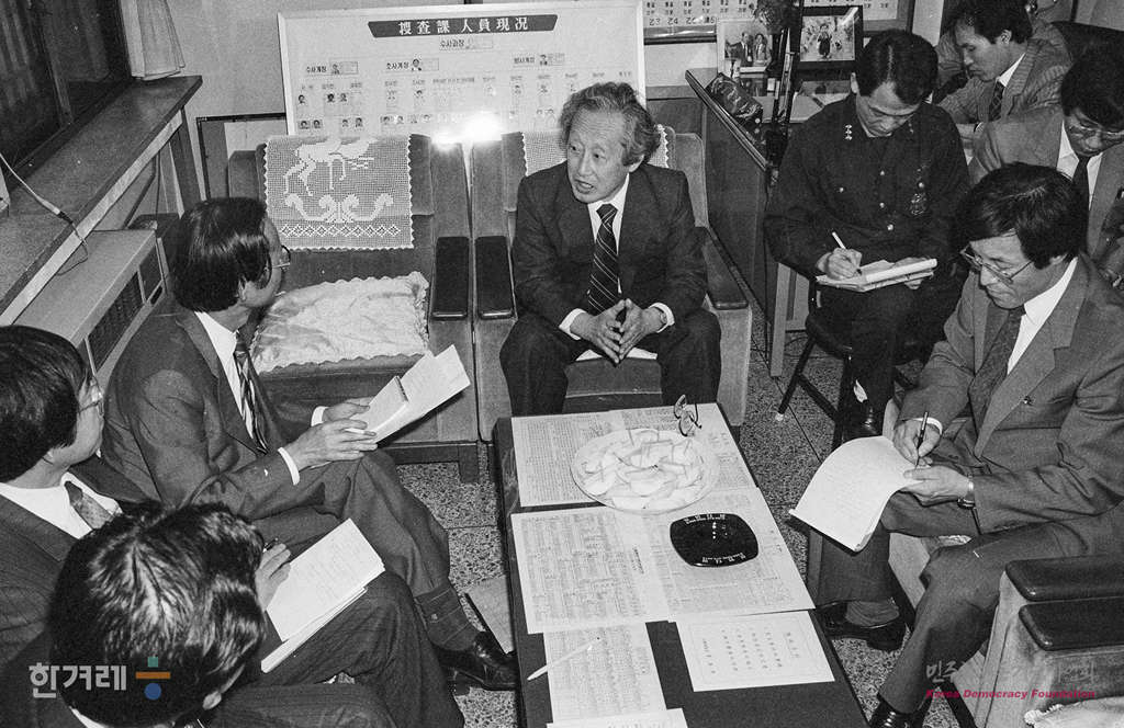 - 1989년 4월 22일 한승헌 변호사 등 문익환 목사 변호인단이 서울 중부경찰서 수사과장실에서 문 목사를 구속이후 처음으로 접견하고 있다.