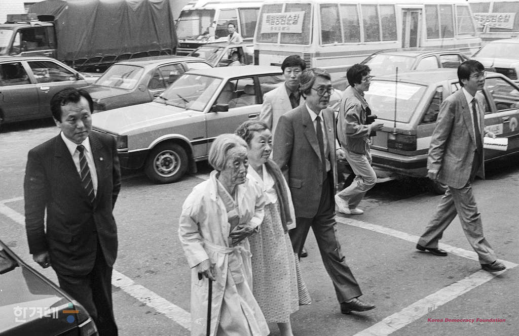 - 1989년 4월 22일 한승헌 변호사 등 문익환 목사 변호인단이 서울 중부경찰서 수사과장실에서 문 목사를 구속이후 처음으로 접견하고 있다.