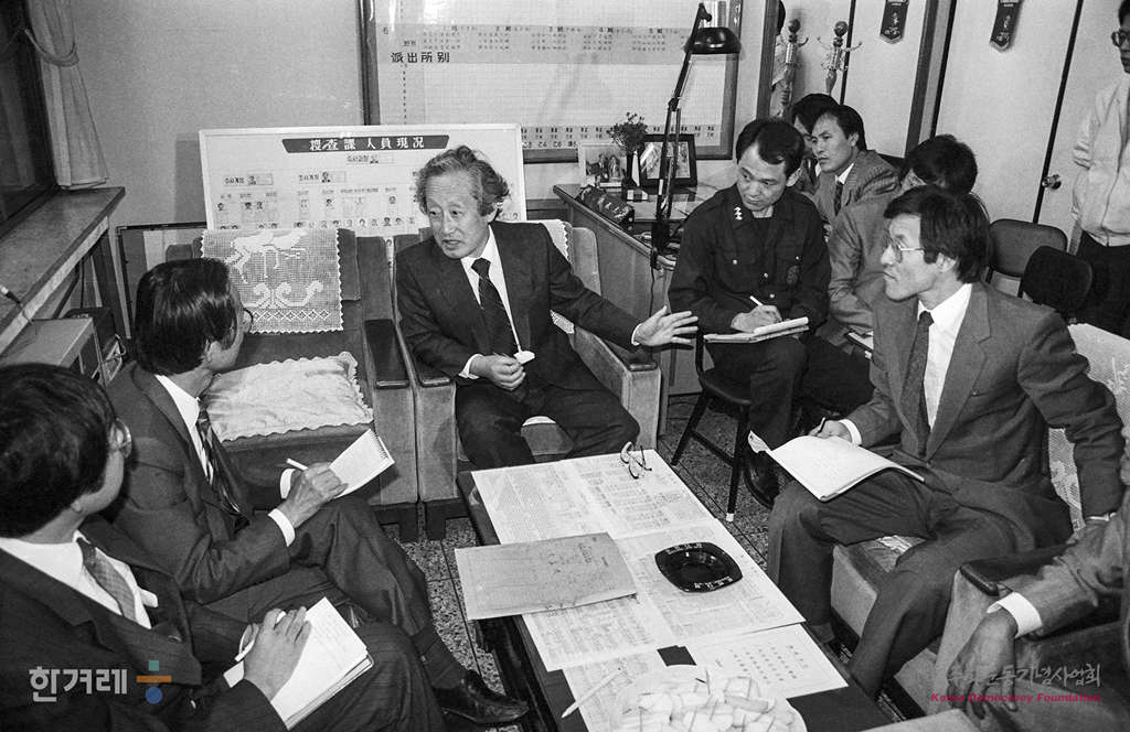 - 1989년 4월 22일 한승헌 변호사 등 문익환 목사 변호인단이 서울 중부경찰서 수사과장실에서 문 목사를 구속이후 처음으로 접견하고 있다.