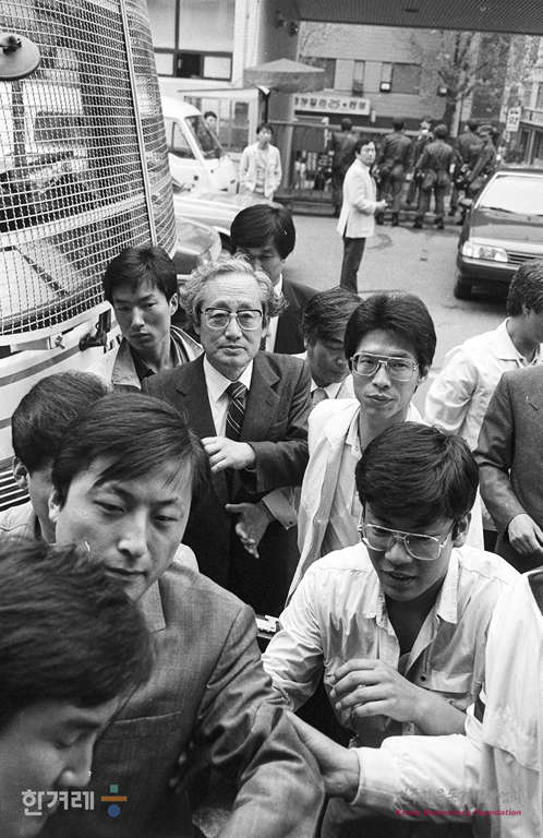 - 1989년 4월 22일 한승헌 변호사 등 문익환 목사 변호인단이 서울 중부경찰서 수사과장실에서 문 목사를 구속이후 처음으로 접견하고 있다.