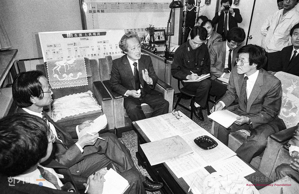 - 1989년 4월 22일 한승헌 변호사 등 문익환 목사 변호인단이 서울 중부경찰서 수사과장실에서 문 목사를 구속이후 처음으로 접견하고 있다.