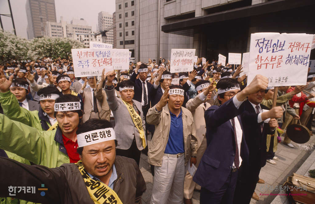 - 1989년 4월 18일 낮 12시 전국언론노동조합연맹 소속 각 신문 방송 통신사의 언론노동자 5백여명이 서울 중구 태평로 프레스센터 앞 광장에서 민주언론쟁취를 위한 전국언론노동자 결의대회를 갖고 한겨레신문 탄압중지 등의 구호를 외치고 있다.