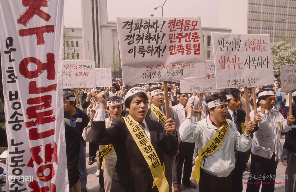 - 1989년 4월 18일 낮 12시 전국언론노동조합연맹 소속 각 신문 방송 통신사의 언론노동자 5백여명이 서울 중구 태평로 프레스센터 앞 광장에서 민주언론쟁취를 위한 전국언론노동자 결의대회를 갖고 한겨레신문 탄압중지 등의 구호를 외치고 있다.