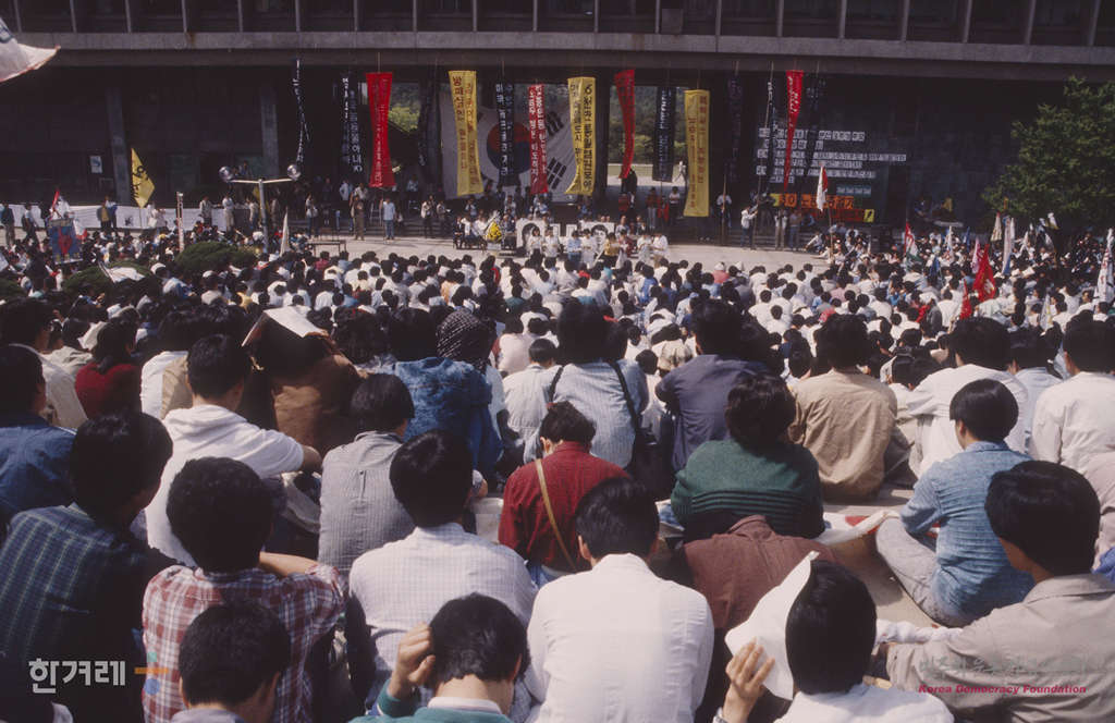 - 1989년 4월 28일 고 김세진 이재호열사 분신 3주기 추모 및 계승 투쟁 결의대회가 서울대 아크로폴리스광장에서 유족들과 대학생들이 참석한 가운데 열리고 있다.