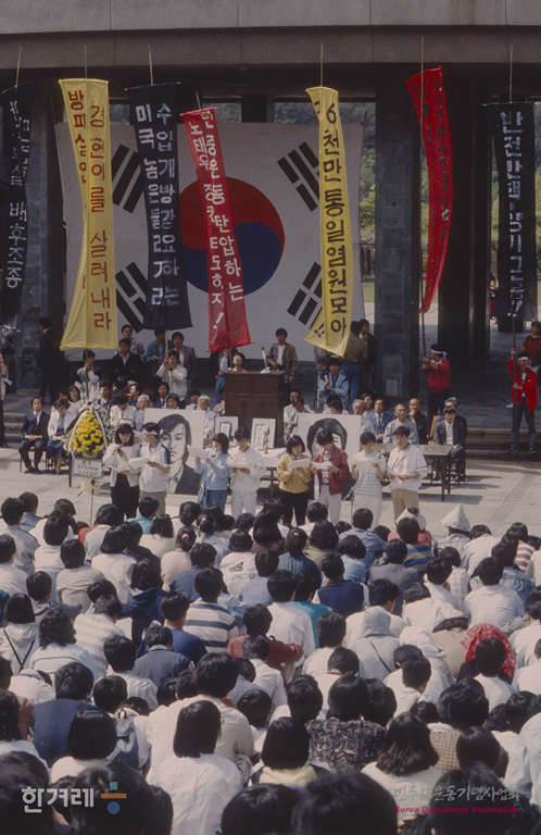 - 1989년 4월 28일 고 김세진 이재호열사 분신 3주기 추모 및 계승 투쟁 결의대회가 서울대 아크로폴리스광장에서 유족들과 대학생들이 참석한 가운데 열리고 있다.