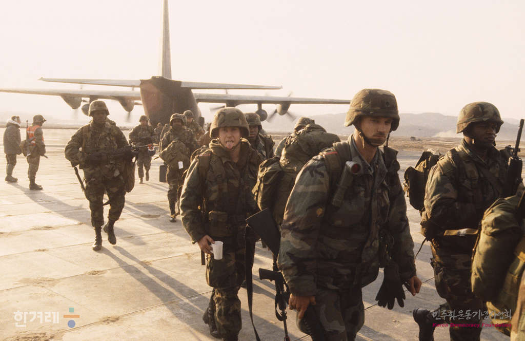 - 1989년 3월 21일 지난 14일부터 시작된 한미연합 합동훈련인 팀스프리트 훈련은 한미연합상륙훈련을 시작으로 경기도 여주 및 이천과 강원도 횡성 및 원주지역으로 긴장지대인 DMZ으로부터 차량으로 한시간반이상 걸리는 후방지역에서 실시됐다. 사진은 평택공항으로 훈련에 참가하는 미군들이 도착하고 있다.