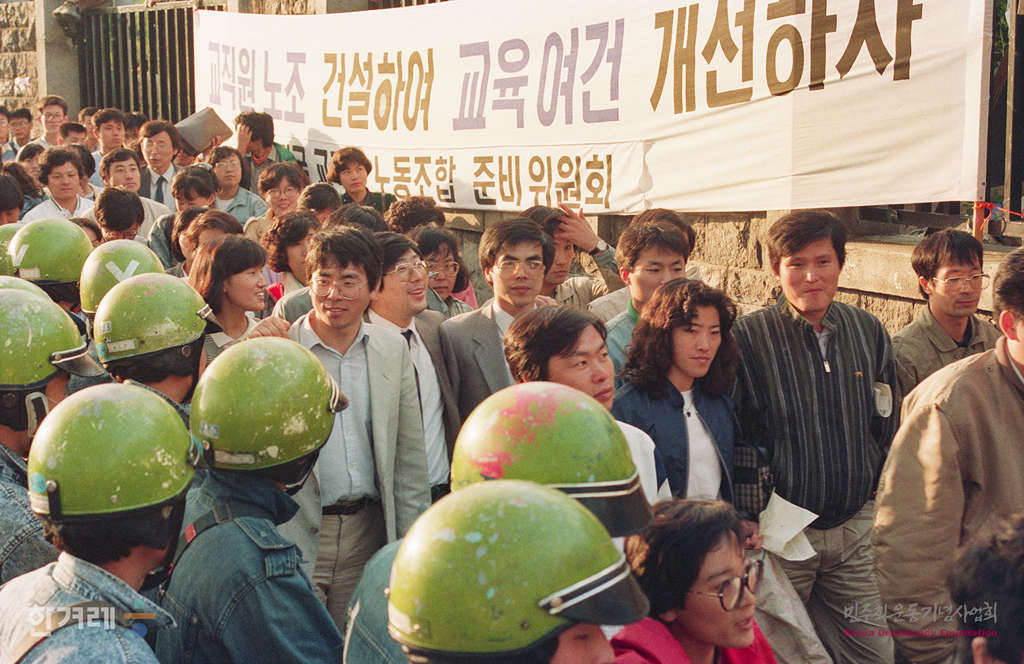 - 1989년 5월 14일 오후2시 전국교사협의회 소속 서울 인천 경기지역 교사들이 연세대 노천극장에서 서울 인천 경기지역 교직원노조 발기인대회 및 준비위원회 결성대회을 하고 있다. 이날 서울을 비롯한 부산 광주 등 전국 10개 지역에서 전국교직원 노조 발기인대회 및 준비위원회 결성대회를 갖고 노조준비위를 발족시켜 오는 28일 교직원 노조 결성대회를 열기로 결정함에 따라 이제 교직원노조 결성을 초읽기에 들어갔다.