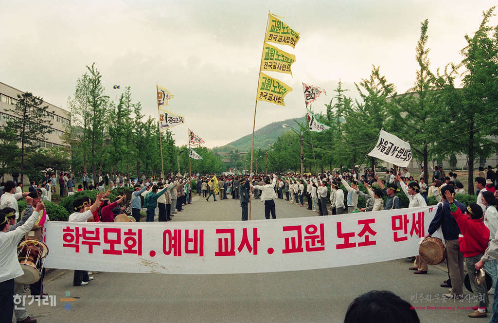 - 1989년 5월 14일 오후2시 전국교사협의회 소속 서울 인천 경기지역 교사들이 연세대 노천극장에서 서울 인천 경기지역 교직원노조 발기인대회 및 준비위원회 결성대회을 하고 있다. 이날 서울을 비롯한 부산 광주 등 전국 10개 지역에서 전국교직원 노조 발기인대회 및 준비위원회 결성대회를 갖고 노조준비위를 발족시켜 오는 28일 교직원 노조 결성대회를 열기로 결정함에 따라 이제 교직원노조 결성을 초읽기에 들어갔다.