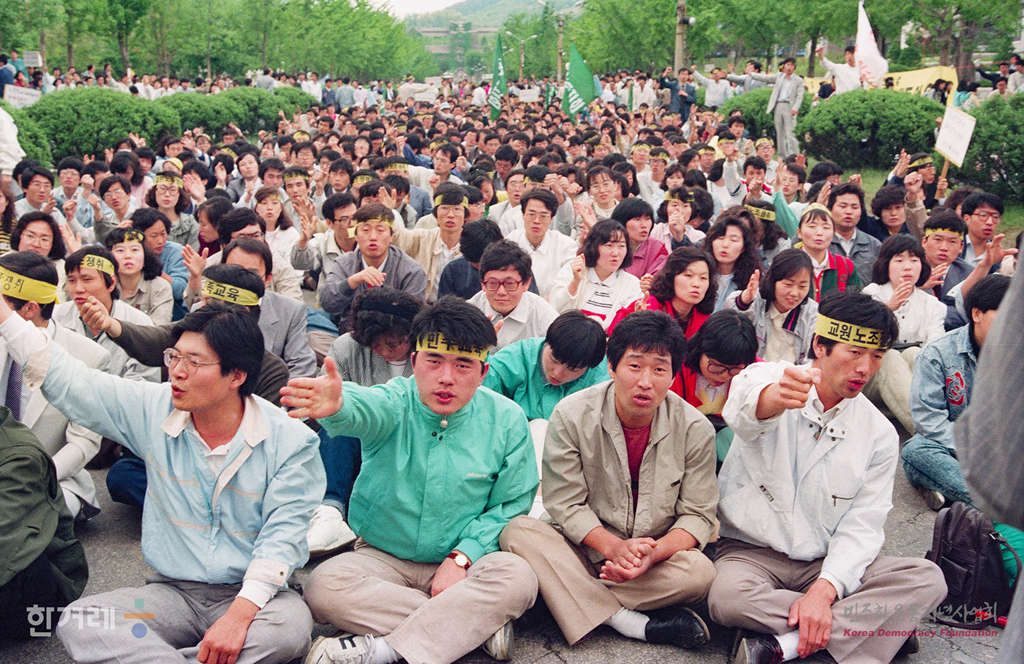 - 1989년 5월 14일 오후2시 전국교사협의회 소속 서울 인천 경기지역 교사들이 연세대 노천극장에서 서울 인천 경기지역 교직원노조 발기인대회 및 준비위원회 결성대회을 하고 있다. 이날 서울을 비롯한 부산 광주 등 전국 10개 지역에서 전국교직원 노조 발기인대회 및 준비위원회 결성대회를 갖고 노조준비위를 발족시켜 오는 28일 교직원 노조 결성대회를 열기로 결정함에 따라 이제 교직원노조 결성을 초읽기에 들어갔다.