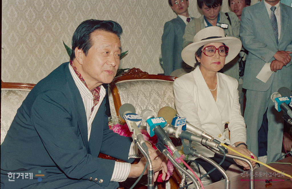 - 1989년 5월 23일 5시 45분 북한에 머문 지 8년만인 지난 86년 3월 북한에서 탈출해서 미국에 체류중인 신상옥 최은희씨부부가 대한항공기 001기편으로 귀국해 지인들과 인사를 나누고 있다.