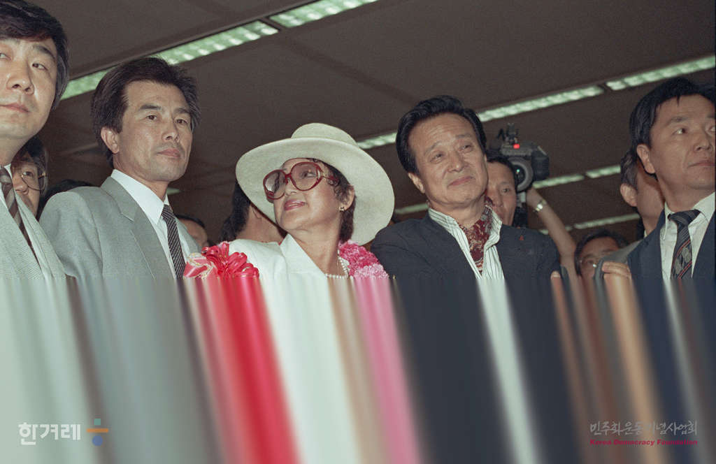 - 1989년 5월 23일 5시 45분 북한에 머문 지 8년만인 지난 86년 3월 북한에서 탈출해서 미국에 체류중인 신상옥 최은희씨부부가 대한항공기 001기편으로 귀국해 지인들과 인사를 나누고 있다.