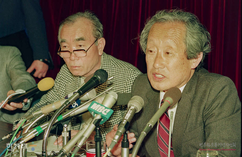 - 1989년 4월 5일 북한방문을 마치고 중국 민항 소속 925편으로 일본 도쿄에 도착한 문익환 목사가 일본 기독교교회협의회에서 기자회견을 갖고 있다. 왼쪽은 통역을 맡은 정경모씨
