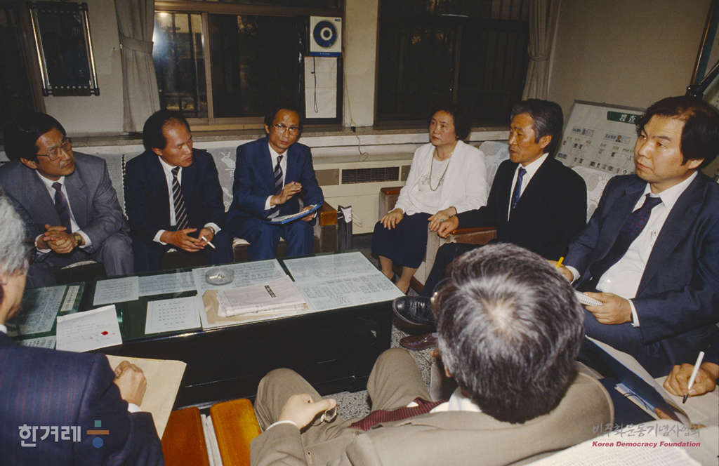 - 1989년 4월 20일 오후6시 이영희 한겨레신문 논설고문이 서울 중부경찰서 수사과장실에서 홍성우 황인철 한승헌 변호사 등 한겨레신문 이고문의 변호인단 11명과 부인 윤영자씨를 만나 안기부 조사과정 등에 대해 말하고 있다.