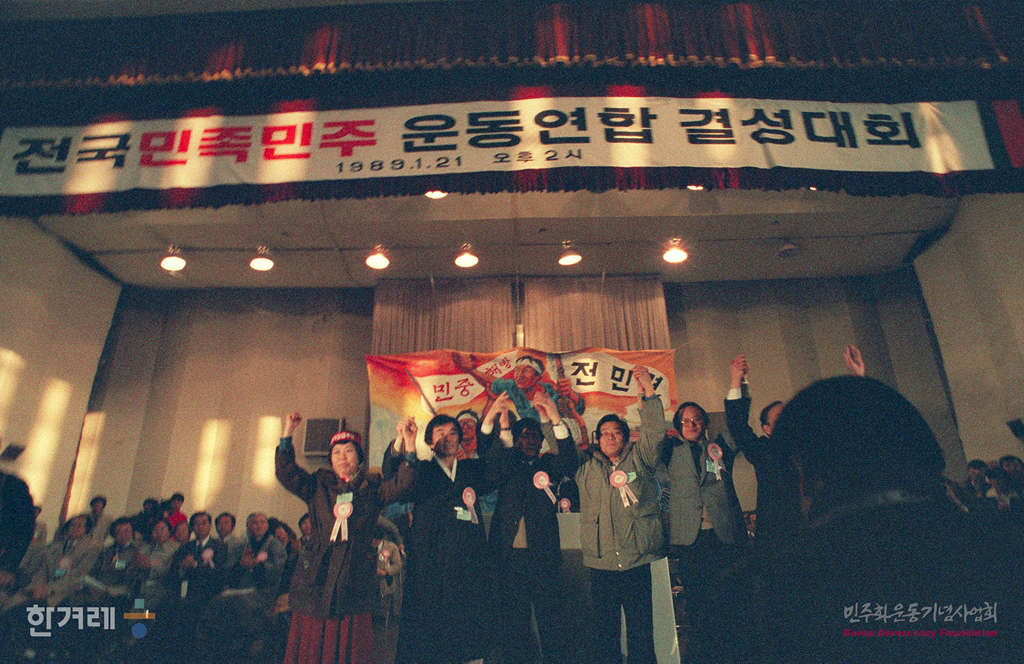 - 1989년 1월 21일 오후2시 재야 민족민주운동세력의 전국통합조직인 전국민족민주운동연합(전민련)이 서울 연세대 대강당에서 결성대회를 갖고 정식출범하고 있다. 서울민족민주운동협의회 등 지역통합단체 12개와 전국노동운동단체협의회 등 부문통합단체 8개등 모두 20갸의 참가단체로 출범한 전민련은 2백여개의 개별운동단체를 포괄하고 있어 건국이후 최대규모의 재야통합단체로 평가되고 있다.
