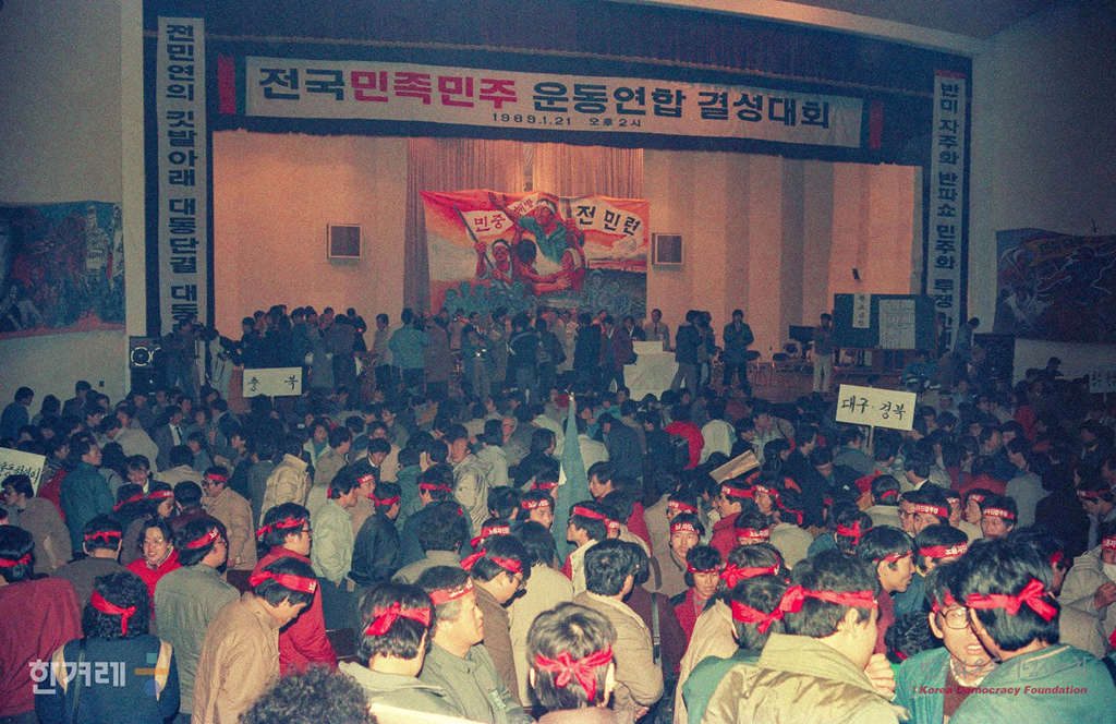 - 1989년 1월 21일 오후2시 재야 민족민주운동세력의 전국통합조직인 전국민족민주운동연합(전민련)이 서울 연세대 대강당에서 결성대회를 갖고 정식출범하고 있다. 서울민족민주운동협의회 등 지역통합단체 12개와 전국노동운동단체협의회 등 부문통합단체 8개등 모두 20갸의 참가단체로 출범한 전민련은 2백여개의 개별운동단체를 포괄하고 있어 건국이후 최대규모의 재야통합단체로 평가되고 있다.