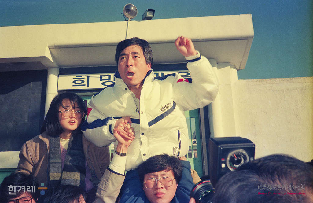 - 1988년 6월 30일 오전 10시 법무부가 재일동포 반공법 및 국가보안법 위반관련자와 김근태씨 등 시국관련 사범 46명을 가석방시킴으로서 광주교도소에 수감된 양심수들이 석방되자 마중나온 시민들에게 손을 들어 인사를 나누고 있다.