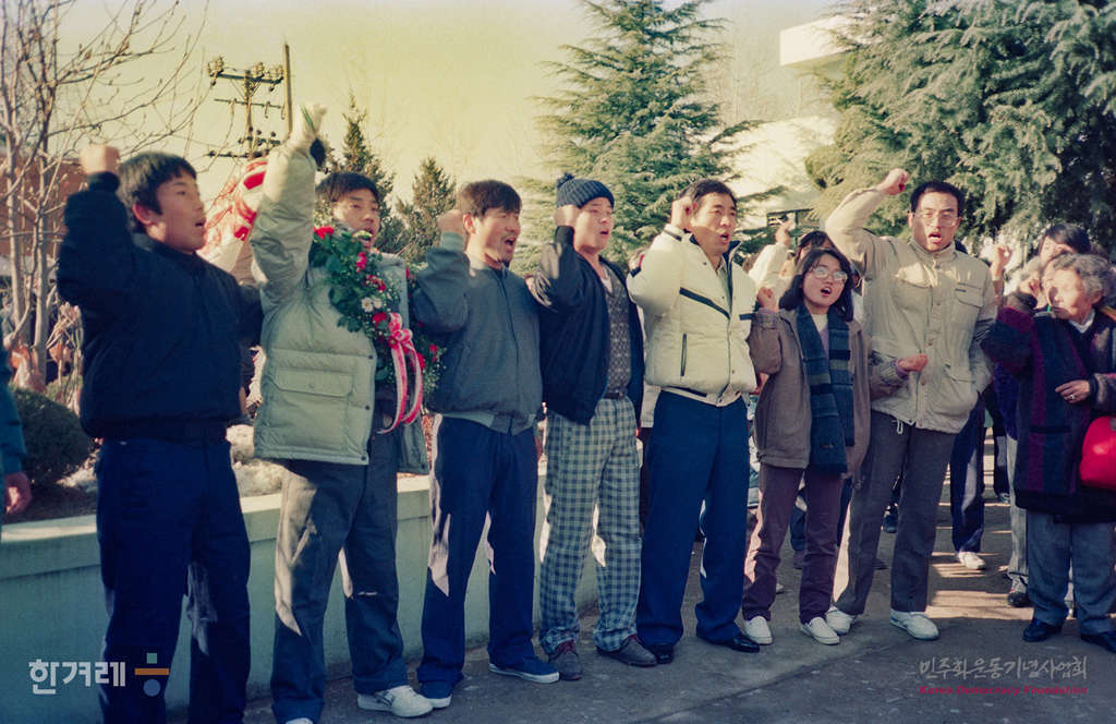 - 1988년 6월 30일 오전 10시 법무부가 재일동포 반공법 및 국가보안법 위반관련자와 김근태씨 등 시국관련 사범 46명을 가석방시킴으로서 광주교도소에 수감된 양심수들이 석방되자 마중나온 시민들에게 손을 들어 인사를 나누고 있다.