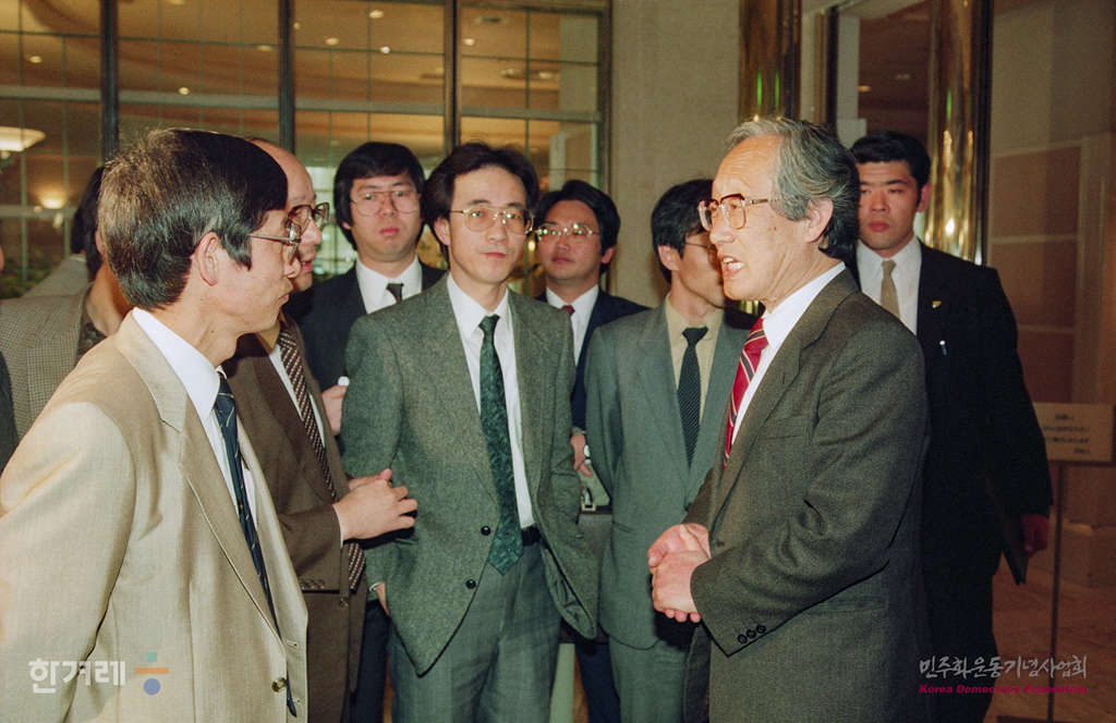 - 1989년 4월 7일 북한 방문을 둘러싸고 국내에서 논란이 있는 가운데 문익환목사가 정경모씨와 함께 일본 공안당국의 보호를 받으며 기자감담회가 있는 도쿄내 한 한국음식점 입구에서 기자들과 얘기를 나누고 있다.