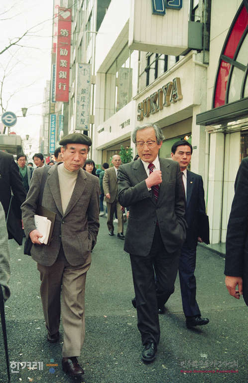 - 1989년 4월 7일 북한 방문을 둘러싸고 국내에서 논란이 있는 가운데 문익환목사가 정경모씨와 함께 일본 공안당국의 보호를 받으며 한국 기자와의 간담회 장소로 가고 있다.