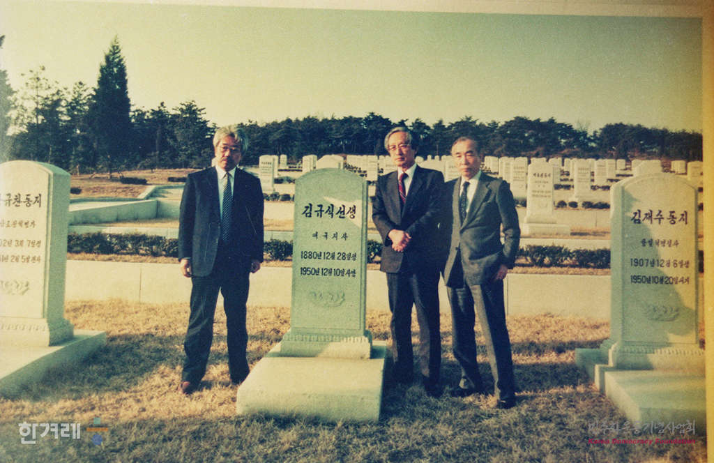 - 문익환목사가 제공한 방북때 북한에서 촬영한 사진. 사진은 문목사일행이 애국열사묘역 김규식 선생 비 아에서 기념촬영했다.