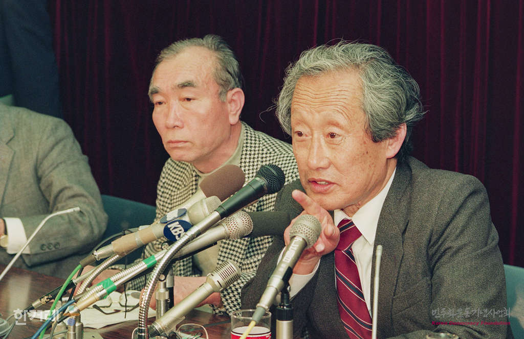 - 1989년 4월 5일 북한방문을 마치고 중국 민항 소속 925편으로 일본 도쿄에 도착한 문익환 목사가 일본 기독교교회협의회에서 기자회견을 갖고 있다. 왼쪽은 통역을 맡은 정경모씨