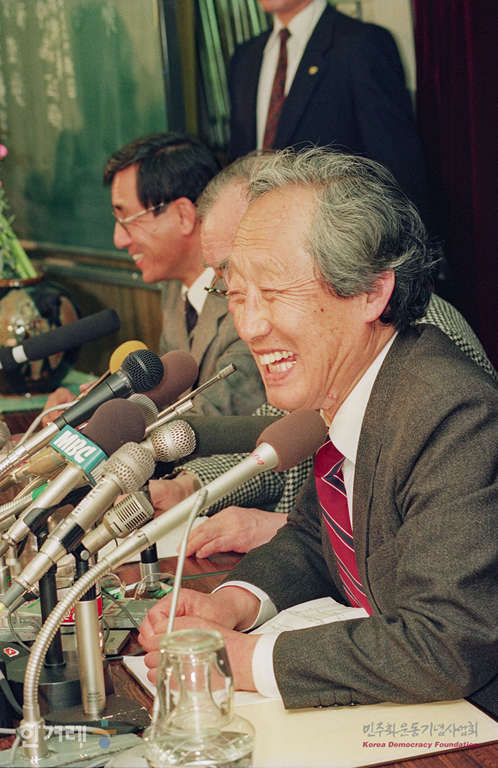 - 1989년 4월 5일 북한방문을 마치고 중국 민항 소속 925편으로 일본 도쿄에 도착한 문익환 목사가 일본 기독교교회협의회에서 기자회견을 갖고 있다. 왼쪽은 통역을 맡은 정경모씨