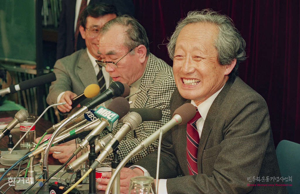 - 1989년 4월 5일 북한방문을 마치고 중국 민항 소속 925편으로 일본 도쿄에 도착한 문익환 목사가 일본 기독교교회협의회에서 기자회견을 갖고 있다. 왼쪽은 통역을 맡은 정경모씨